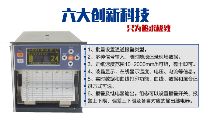 SIN-R1200有紙記錄儀最多具有8路輸入通道,通道之間采用點點隔離的方式。每路通道均可以接收多種信號,如:熱電偶信號、熱電阻信號、電壓信號、電流信號等。記錄儀可以對被測信號進行數字顯示、趨勢記錄以及數字記錄,能在110mm寬的紙格上同時記錄刻度值、時間以及每個信號的曲線并且將通道號印在各通道的軌跡旁邊。